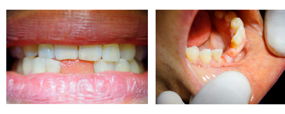 Paciente femenino de 44 años de edad; aparentemente sana solicita atención dental por perdida de órganos dentarios 31 y 41 a la edad de 20 años en accidente casero; se practica historia clínica y la firma, acepta el tratamiento y otorga consentimiento con publicación de su caso clínico. En la exploración no presenta patologías bucales y hay ausencia dental de los dos órganos dentales centrales inferiores (fig. 1); se observa espacio interdental entre los laterales inferiores de 7.3 mm y una reabsorción completa del reborde mandibular (fig. 2).