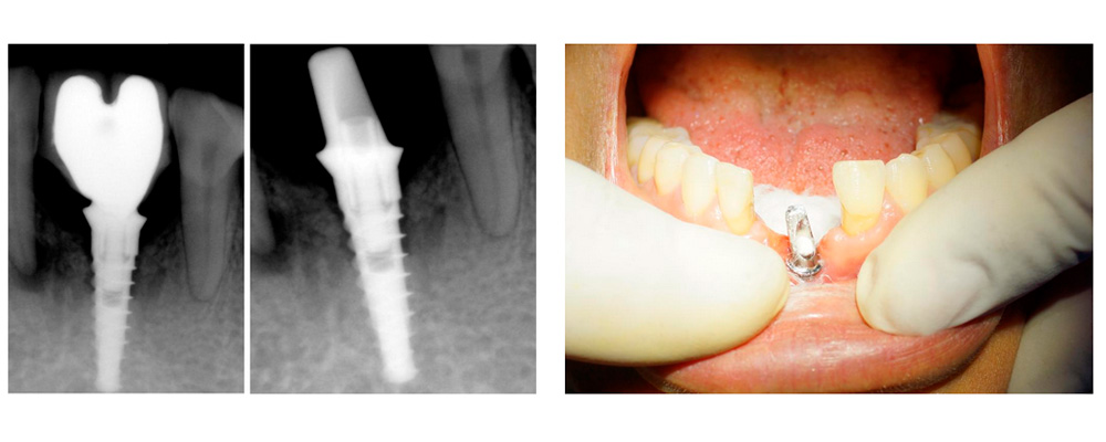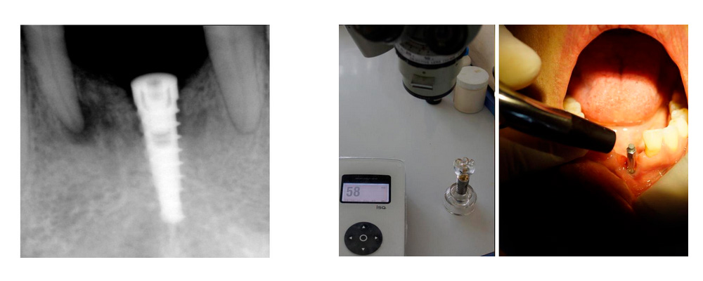 Tratamiento: La falta de espacio interproximal y la ausencia de hueso del reborde alveolar nos obliga a la colocación de un solo implante dental de titanio DSI con conexión interna hexagonal (3.75 de diámetro y 13.0 mm de longitud) sobre la línea media en la zona mentoniana, como lo muestra la radiografía periapical de la figura 3 y la clínica en la figura 4; la medición del OSSTELL aloja 58 ISQ a los 4 meses de la colocación del implante (fig. 5). Para la rehabilitación protésica se usa un pilar angulado a 17 grados como se muestra en la figura 6 y 7; en la radiografía de la figura 8 se muestra una corona de metal porcelana y dos pónticos para sustituir los centrales inferiores y la caracterización de la encía en porcelana (fig. 9).