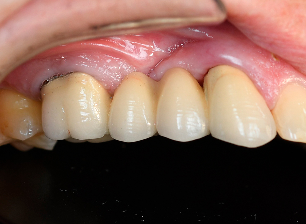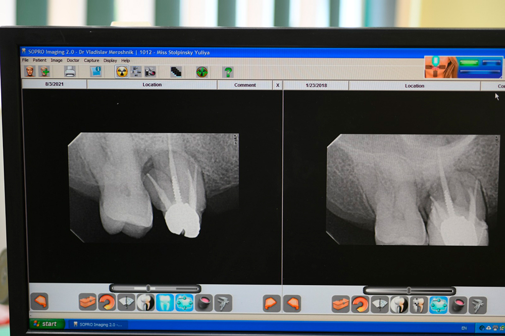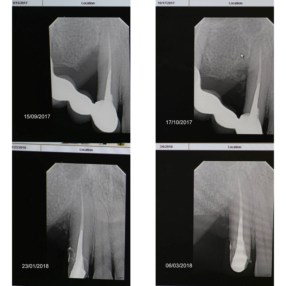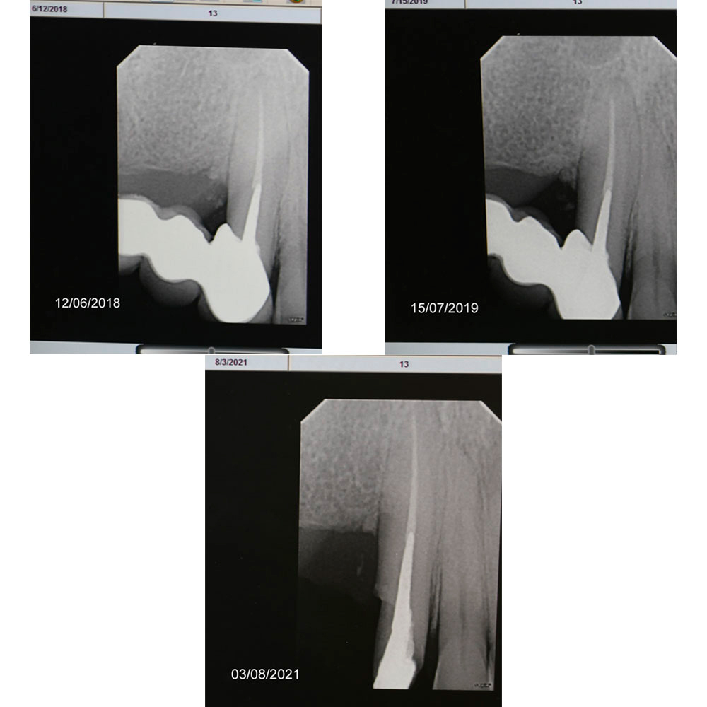 Dear colleagues, I would like to share a clinical case that I have been observing since 2017. A patient came to the clinic with complaints of swelling and pain in the area 1.3, 1.4, 1.5. Conservative therapy was suggested, and after dealing with the acute period, a surgical procedure including cleaning of the periodontal pocket, scaling and root planing and filling the bone pocket with DSI Syntoss Plus that contains beta-tricalcium phosphate granules. The procedure was performed in 2017, the old bridge was replaced with a new one, which is fixed with temporary cement for regular revision due to the unstable condition of 2.6. The patient is unable to undergo implantation for a number of reasons, so the 2.6 will be kept until the last possible moment. Its mobility is grade 2 and the condition of the mucosa can be seen in the photo. The whole process of bone maturation is shown on the x-rays. Thank you for your attention.