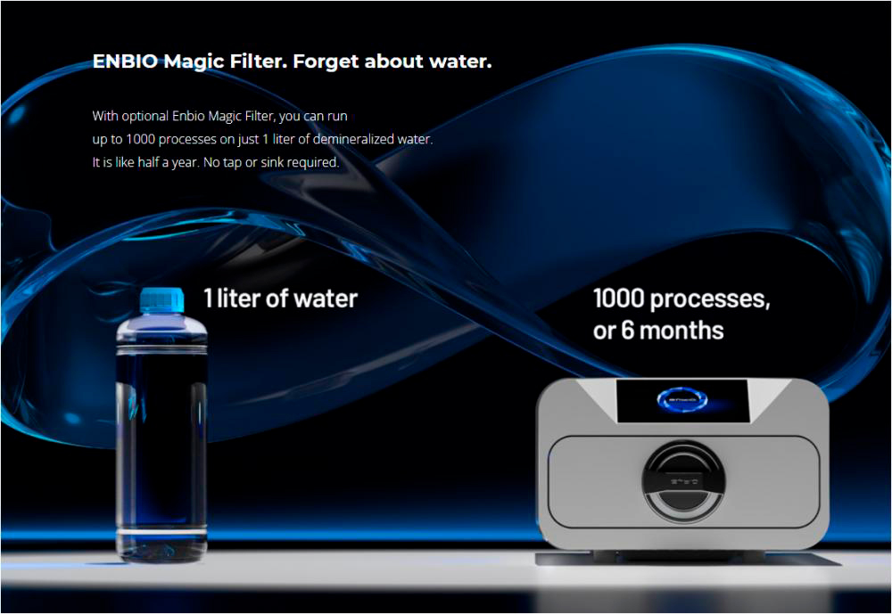 האוטוקלאב מצויד במג'יק פילטר Enbio Magic Filter בעזרתו האוטוקלאב יכול להריץ עד 1000 הליכים על ליטר אחד בלבד של מים. אין צורך בחיבור לברז או כיור. התקנה קלה: פשוט לחבר לבקבוק מים.