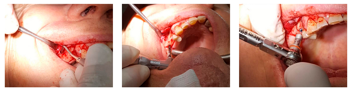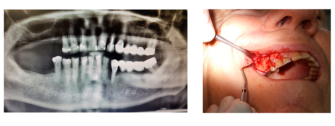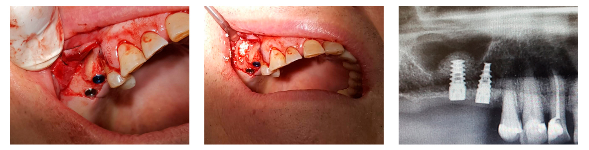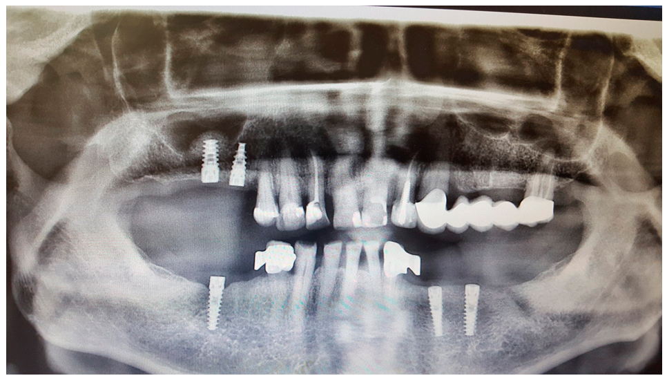 Sinus lifting was performed simultaneously with implantation. (Syntoss Bone Graft, DSI Premium Implants, DSI Silk 5.0 sutures). After a four-month recovery period, trepan open implants and abutments added using a direct impression technique.